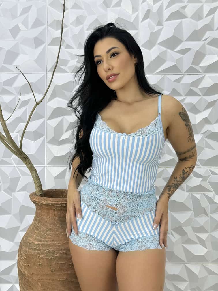 Conjunto de dormir, blusa e short, em tecido com detalhes em renda.