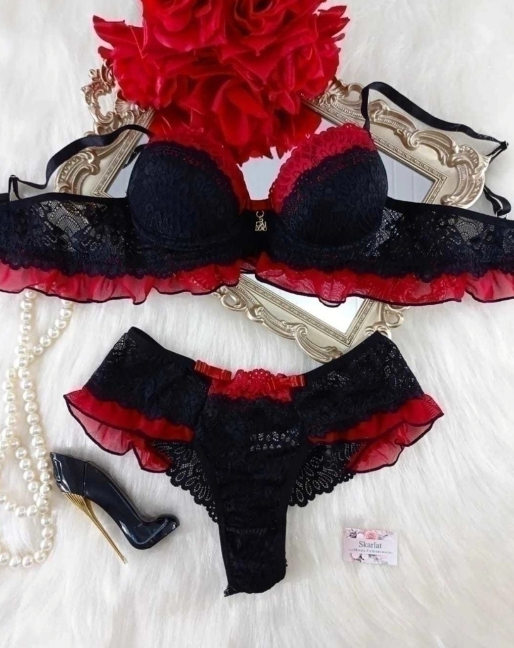 O conjunto é confeccionado em materiais leves e flexíveis com renda na parte superior e detalhes em tecido vermelho transparente. O bojo traz firmeza e o acabamento em renda permite movimento e adaptação ao corpo. Ideal para quem busca lingerie balanceando charme e funcionalidade.