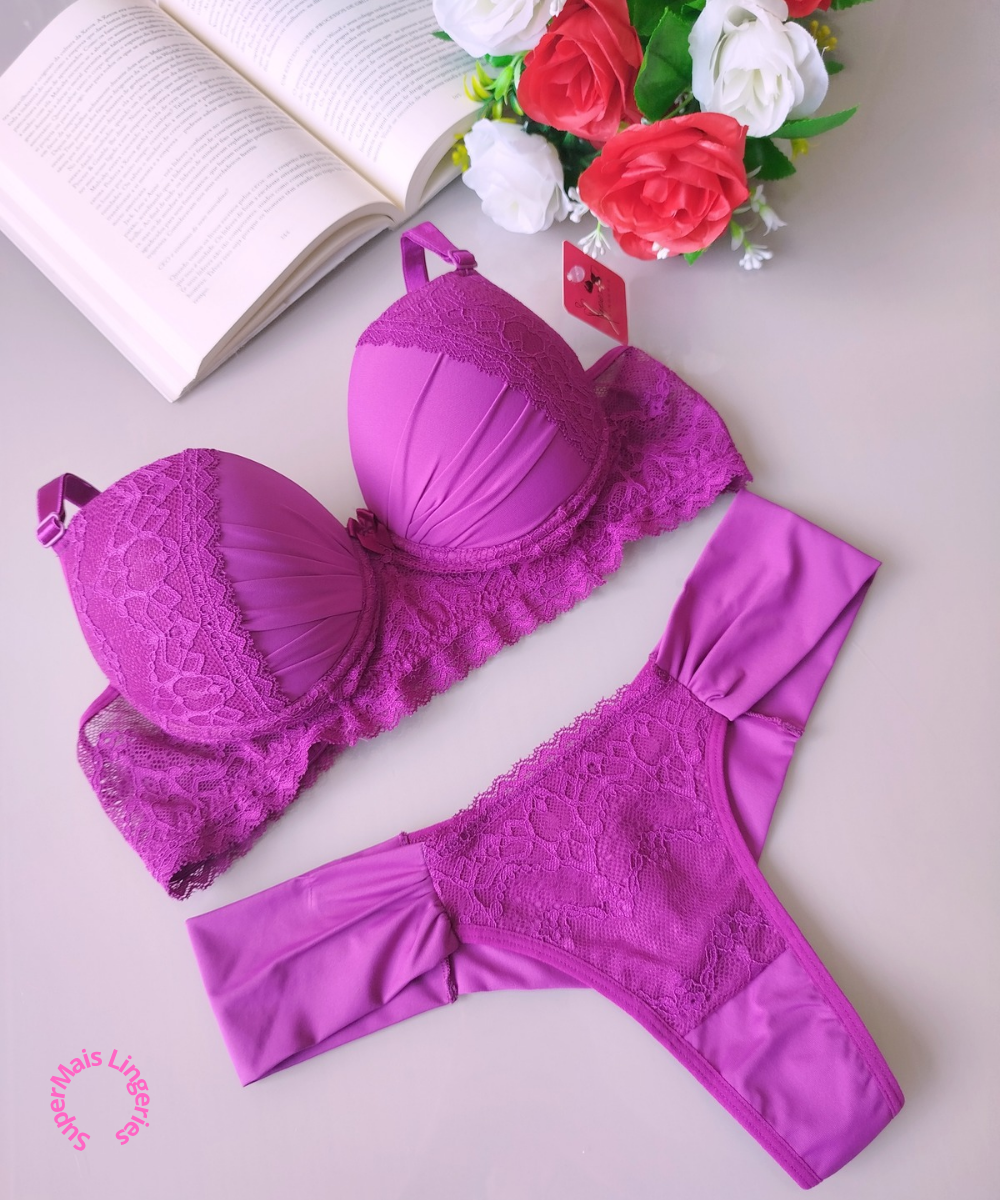 Conjunto Sutiã e Calcinha, sutiã com renda sobreposta, regulagem de plástico. Calcinha fio duplo com detalhes em renda na frente.