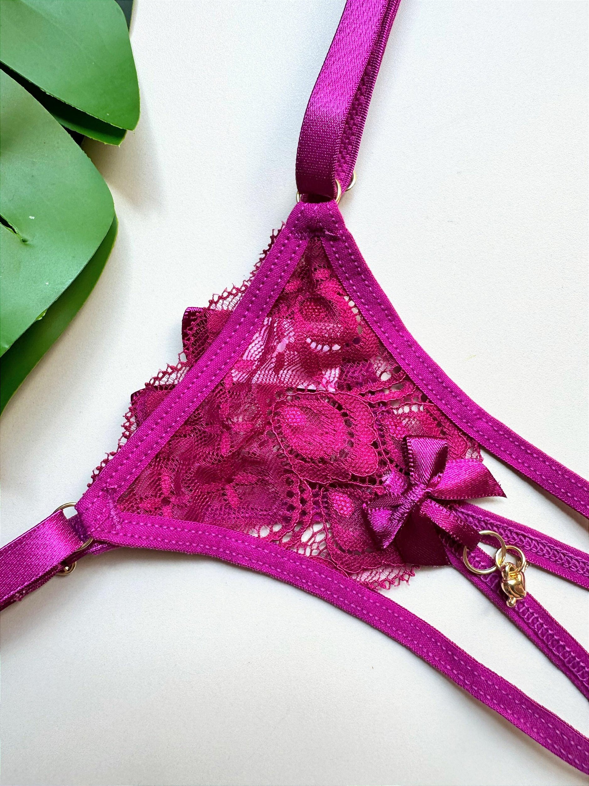 Tanga confeccionada em renda com alça de regulagem de coração em metal dourado, com o fundo aberto.